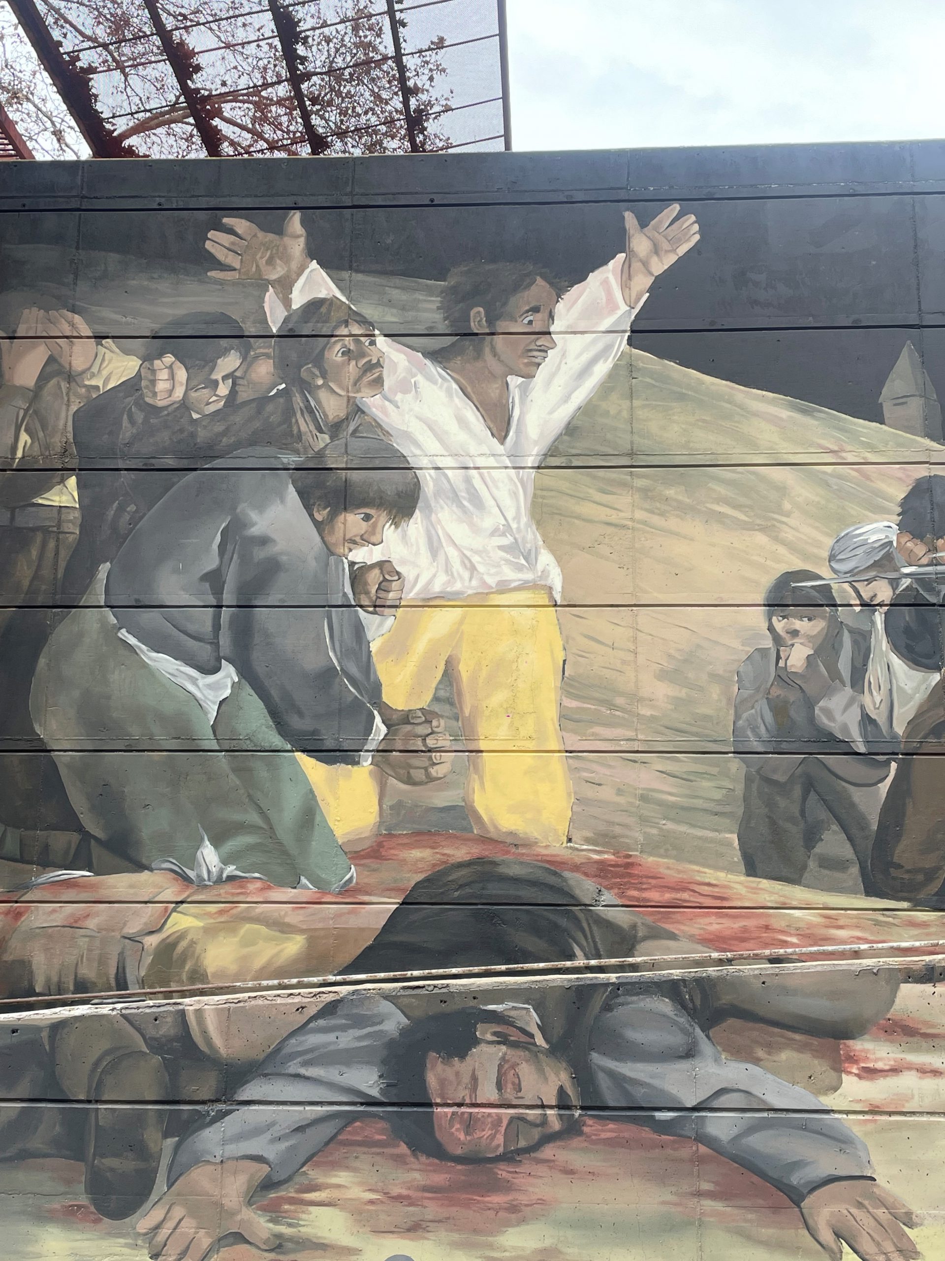 Un mural de 300 metros cuadrados representa una de las obras más reconocidas de Francisco de Goya: Los fusilamientos del 3 de mayo. Además, se representan dos autorretratos del pintor.